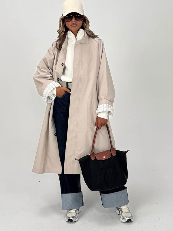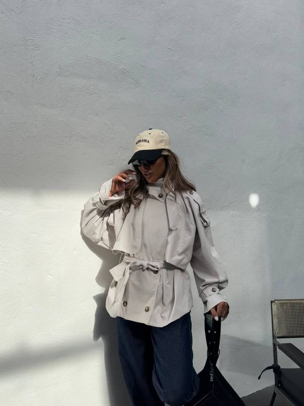 برای روزمره: بارانی کوتاه + جین آبی + کتونی سفید.