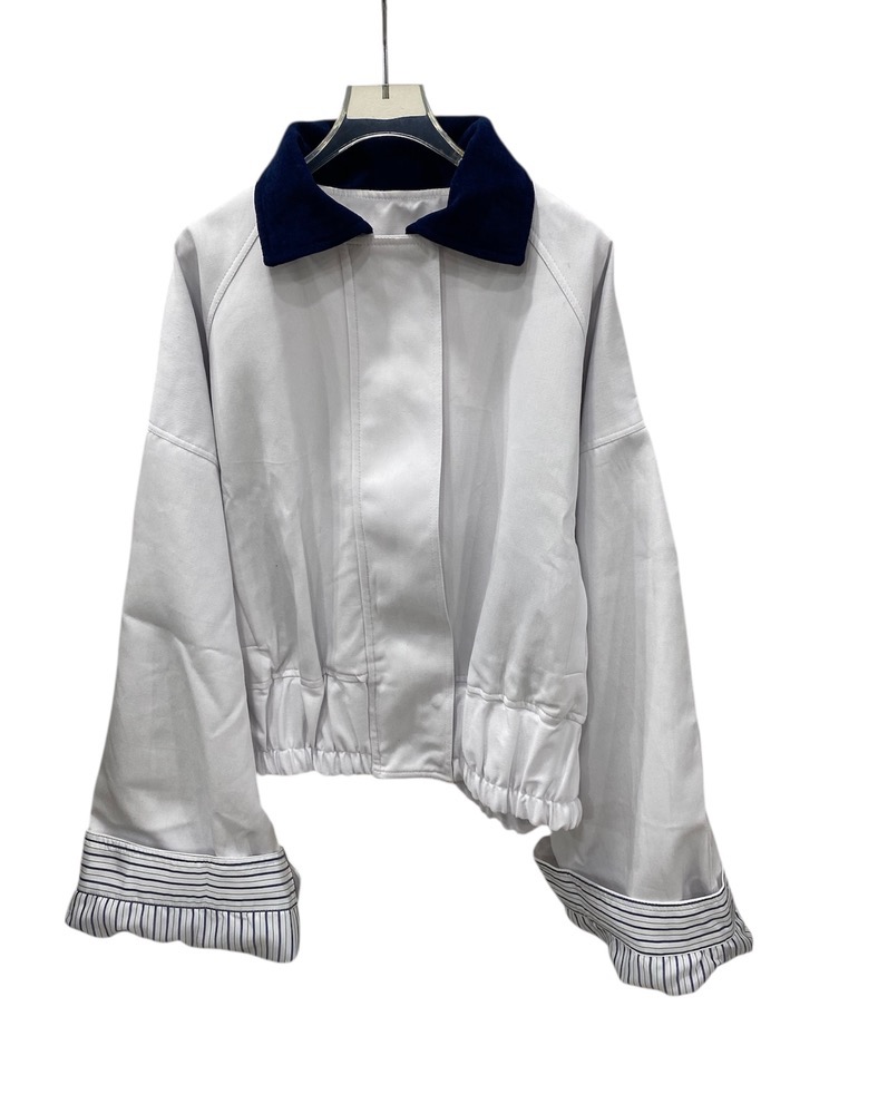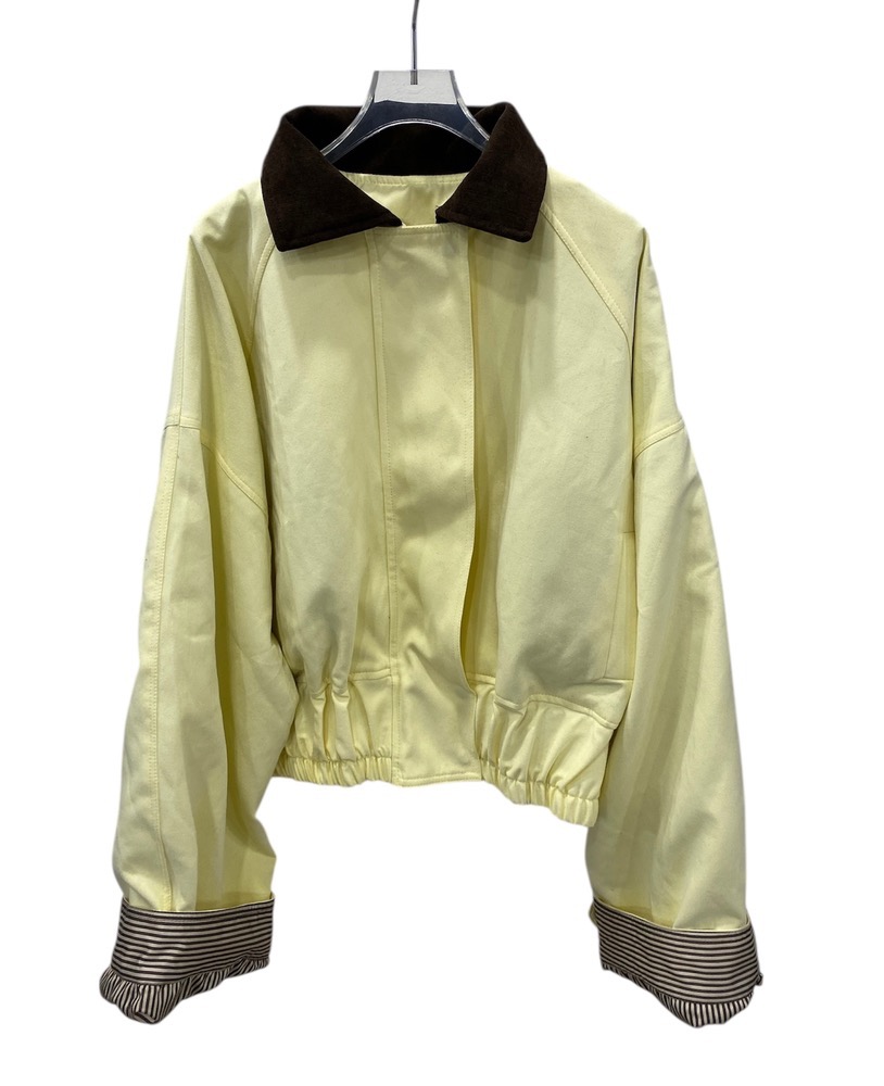 یقه با زاویه ملایم و لبه های گرد طراحی شده تا با ساختار نسبتا صریح خط دوختها هماهنگ بشه. آستر داخلی سبک و یکدست انتخاب شده تا حجم اضافه ایجاد نکنه و فرم جکت در حالت بسته یا باز، یکسان باقی بمونه.