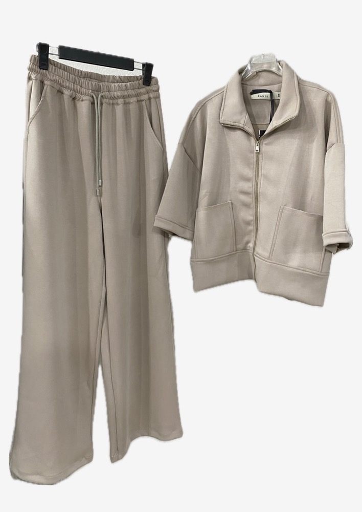 جکت طراحی تمیزی داره؛ زیپ دار و بیجزئیات اضافی، با فرم نیمه آزاد که هم میتونی زیرش لباس بپوشی، هم به تنهایی استفادش کنی. شلوارش هم از نوع فیت راحت با کمر کشی طراحی شده تا موقع حرکت یا نشستن، اذیت نکنه و فرم خودش رو حفظ کنه.