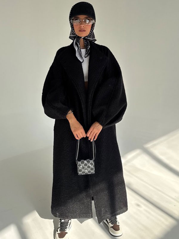 استایل مینیمال و تکرنگ: اگر پالتو به رنگ خنثی باشد (مثلاً طوسی، کرم یا مشکی)، با شلوار جذب مشکی + نیمبوت مشکی + کلاه بافتنی ساده ترکیب کن استایلی مینیمال، آرام، شیک و زمستانی.